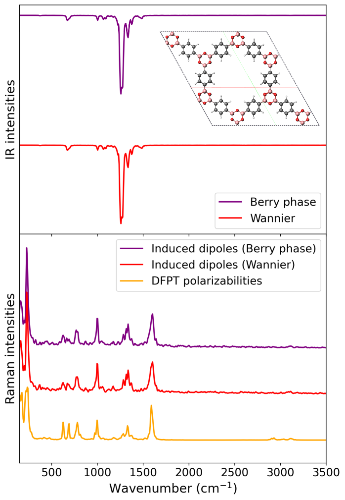 MD-based vibrational spectra of COF-1. The top panel shows the IR spectra computed using Berry phase dipole moments and Wannier centers. The bottom panel presents the corresponding Raman spectra, where the polarizabilities are obtained either from induced dipoles using the indicated methods or directly from DFPT polarizability files. The top view of the COF-1 supercell is also shown.