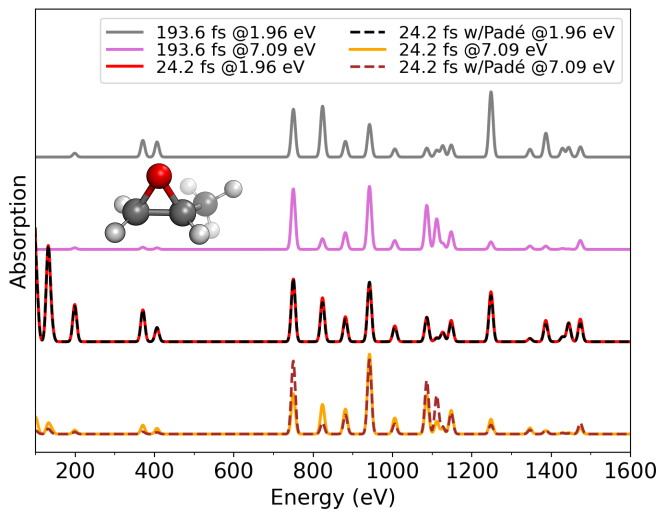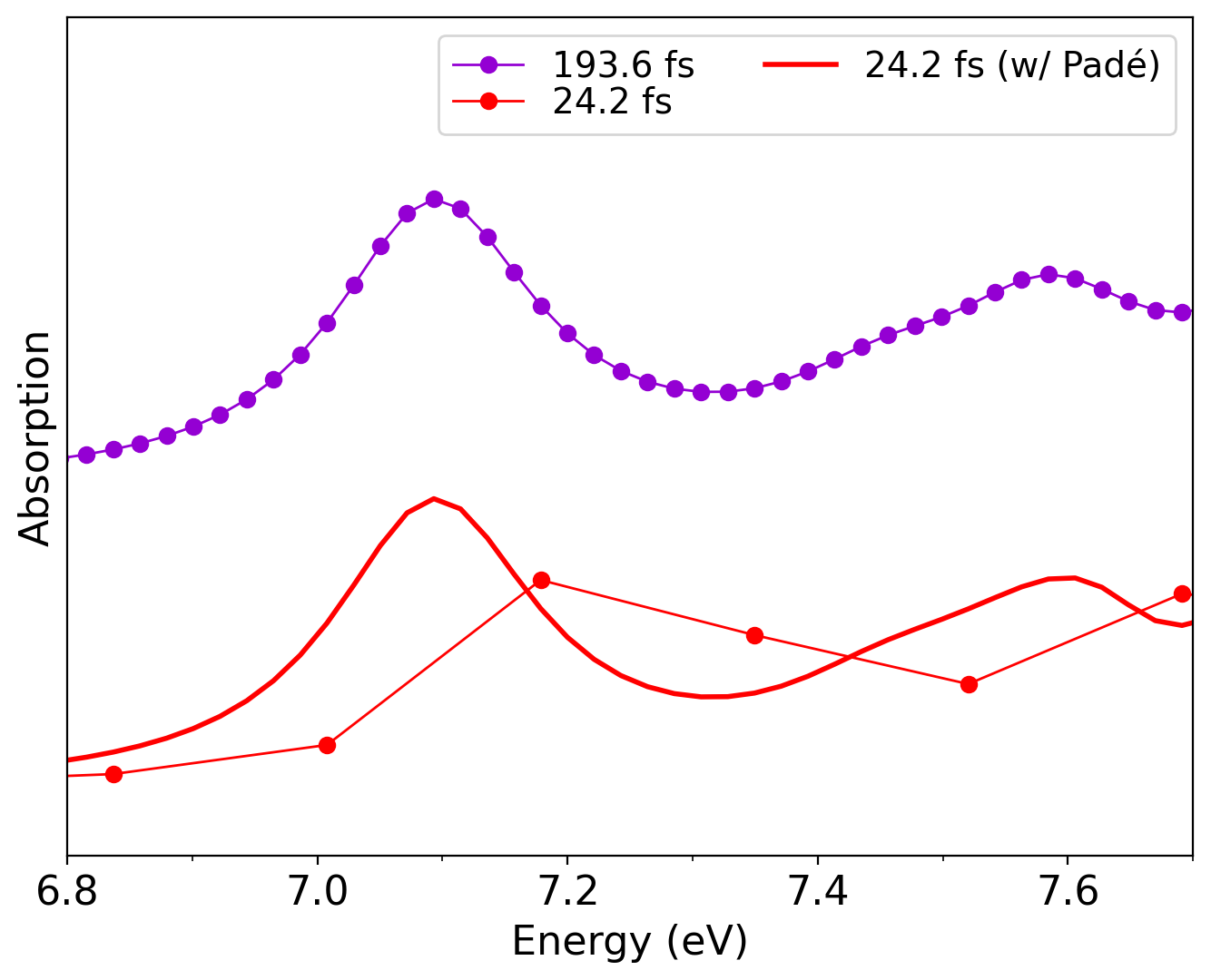 The figure shows that the 1.96 eV trajectory fails to fully capture the resonance features due to limited spectral resolution. In contrast, applying Padé approximants recovers the correct enhancement of peaks in resonance at 7.09 eV, yielding convergence comparable to the spectrum obtained from the 193.6 fs RT-TDDFT trajectory.