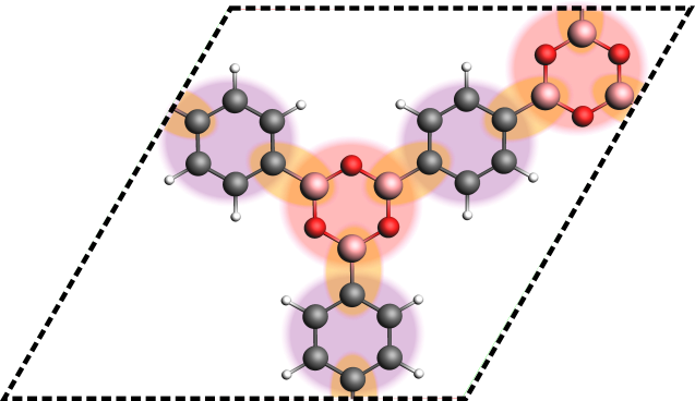 Assigned fragments in a framework system (COF-1). The boroxine and phenyl fragments of the system are highlighted in red and purple, the connecting B-C bonds are highlighted in orange.